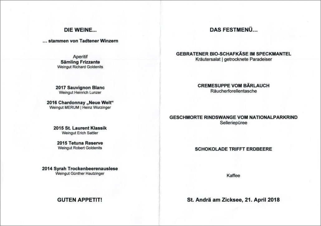 Der Gasthof zur Linde in St. Andrä am Zicksee war erstmalig Ort einer Veranstaltung unserer Komturei. Der neue Festsaal bildete einen wunderschönen Rahmen für unser heuriges Frühlingsfest am 21. April. Die beiden Winzer Heinrich Lunzer & Heinz Wurzinger präsentierten uns ihre, und auch die Weine von vier weiteren Kollegen des Weinbauvereines Tadten. Ein herzliches Dankeschön an die beiden für ihre Zeit und Mühe.