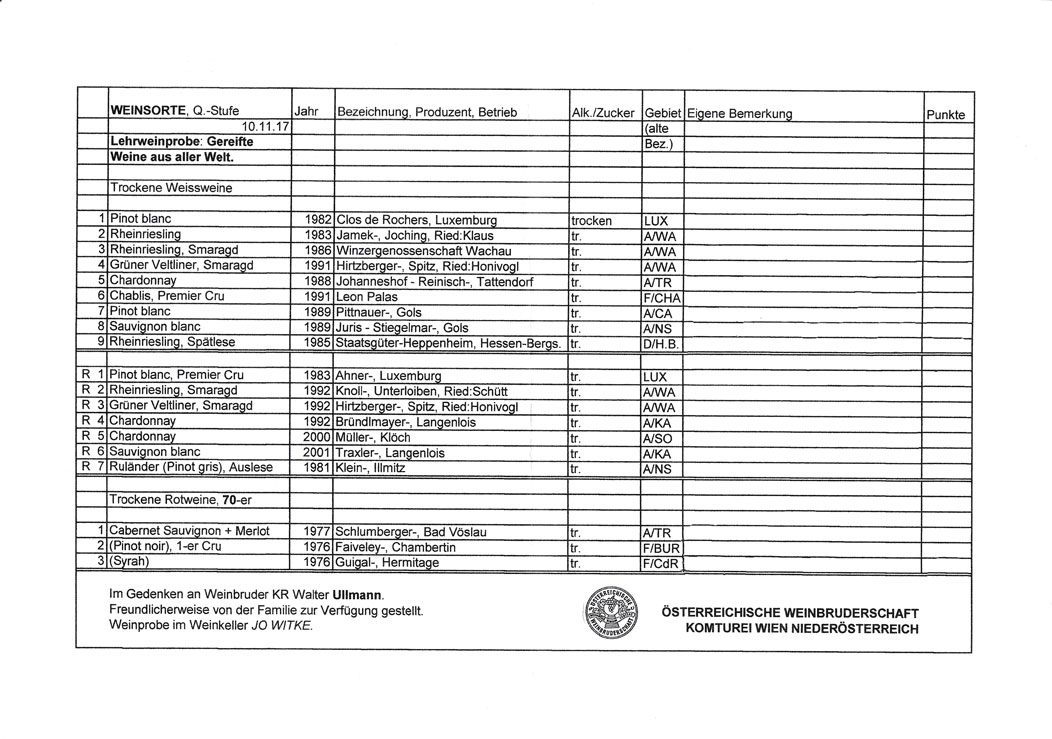 Schon im November 2017 kamen die Weinbrüder der Komturei Wien – Niederösterreich in den Genuss hervorragend gelagerte und von unserem Kellermeister Martin Fürnhammer ausgesuchte gereifte Weine aus der Hinterlassenschaft des leider verstorbenen Weinbruders KR Walter Ullmann. Da diese Weine tatsächlich in großer Zahl sehr gut erhalten sind und es noch sehr viele Weine übrig waren entschloss man sich in der Komturei einen zweiten Abend ab zu halten.