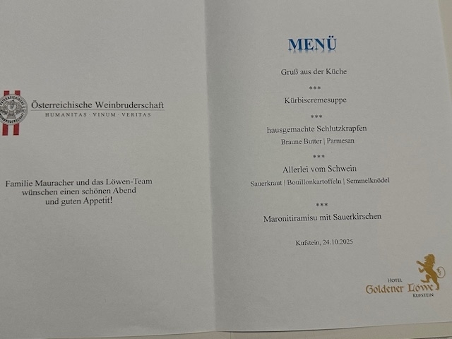 Doch warum in die Ferne schweifen, wenn das Gute liegt so nah!? Was unsere Südtiroler Freunde können, bringen auch wir Nordtiroler vortrefflich auf den Teller und ins Glas – zumal wir mit unserem WB Christian Wagner und seinem Team vom „Goldenen Löwen“ auf eine ausgezeichnete Küche zurückgreifen können.