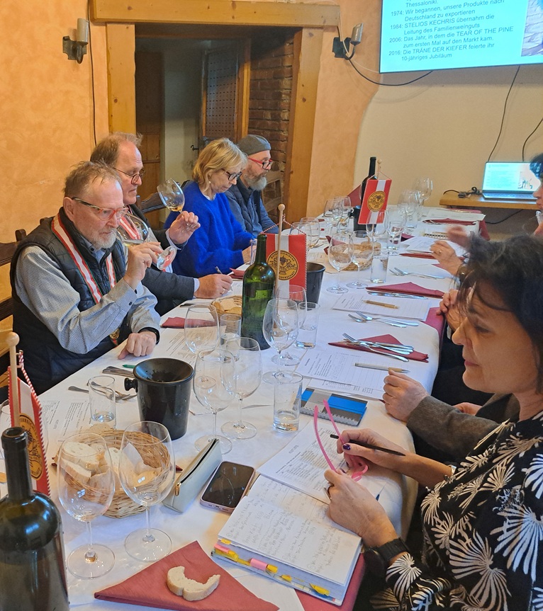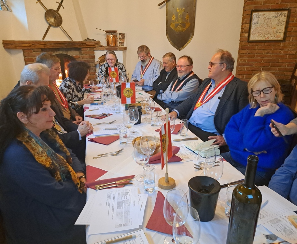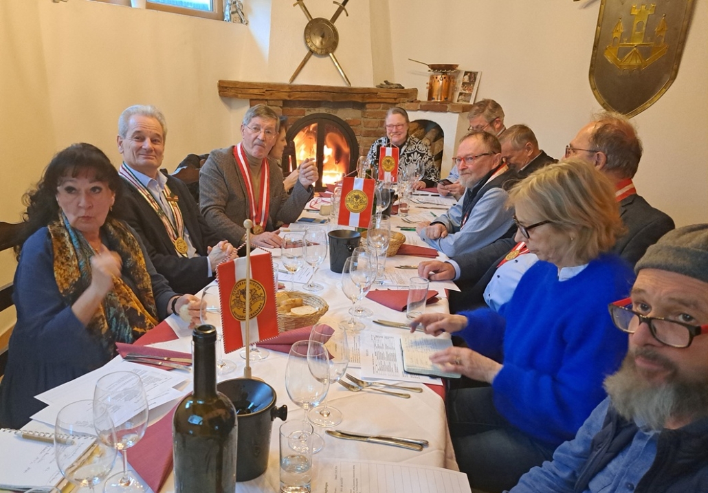 In der Friesacher Schenke zum Krebsen konnten wir Weine aus Nordmazedonien und Nordgriechenland verkosten und freuten uns zugleich auch unseren neuen WB Dr. Peter Kurnik in der Komturei Kärnten offiziell willkommen zu heißen. Komtur Hubert Ache präsentierte uns hauptsächlich aus einer Urlaubsreise mitgebrachte Weine, die aus autochthonen Rebsorten gekeltert wurden. Die Weißweine zeigten allesamt Frische und Geradlinigkeit mit einer gut balancierten Säure und integrierter Fruchtsüße, die mit ihrer eher schlanken Struktur absoluten Trinkspaß bereiteten. Die Rotweine waren allesamt mit kräftigem Körper ausgestattet, wiesen eine dichte Textur, reife u. samtige Tannine, sowie einen langen, würzigen Abgang auf. Der im Holzfass gereifte Retsina aus der Assyrtiko-Traube war ein Tropfen der Extraklasse. Die Weine haben in erster Linie Freude geschenkt, die wir in einer geselligen Runde an diesem Nachmittag mit ausgezeichneten Lammgerichten teilen konnten.